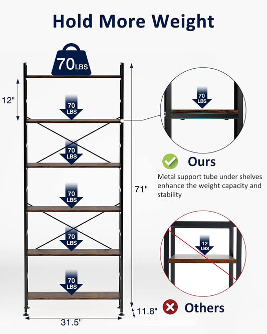 6-Tier Adjustable Bookcase, Rustic Wood & Metal Bookshelf